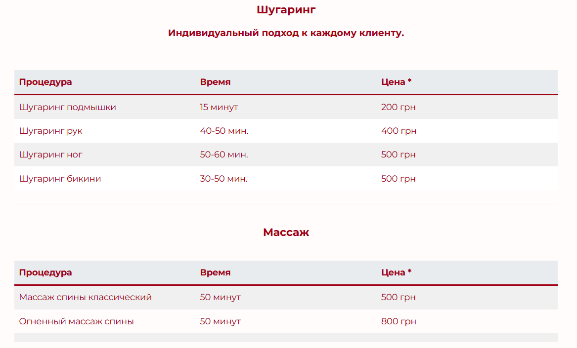 Тут ви знайдете актуальні ціни на всі мої послуги — від шугарингу до масажу. Вартість формується чесно та прозоро, з урахуванням усіх матеріалів, індивідуального підходу та комфортних умов.
